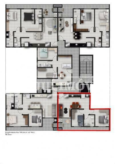 Apartamento de 2 dormitórios sacada com churrasqueira, instalação para água quente, iluminação inteligente nas áreas comuns, piso em porcelanato e acabamento em gesso no teto, 1 box de garagem.
