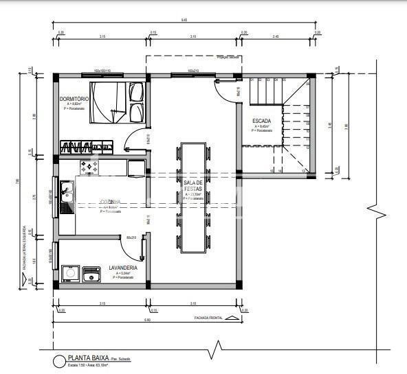 Parte inferior banheiro, lavanderia, salão com churrasqueira.
