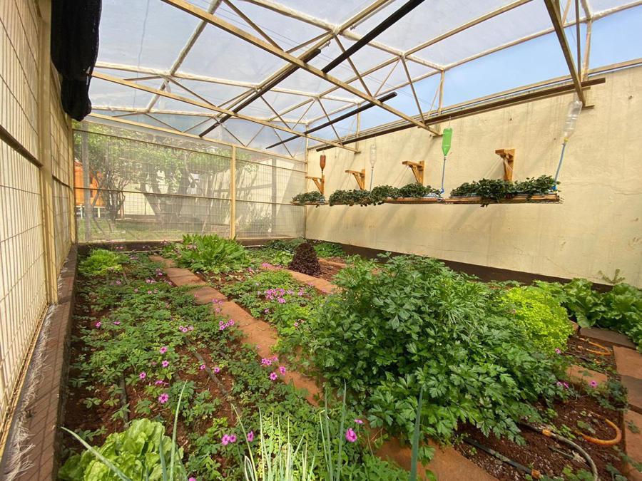 parreiral, horta, estufa com irrigação da água da chuva (através de cisterna acoplada as calhas do